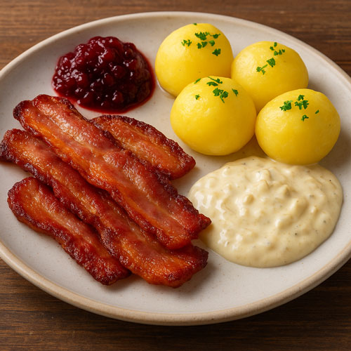 Stekt fläsk med potatis, sylt och löksås Gäller från kl. 11:00 till kl. 15:00.